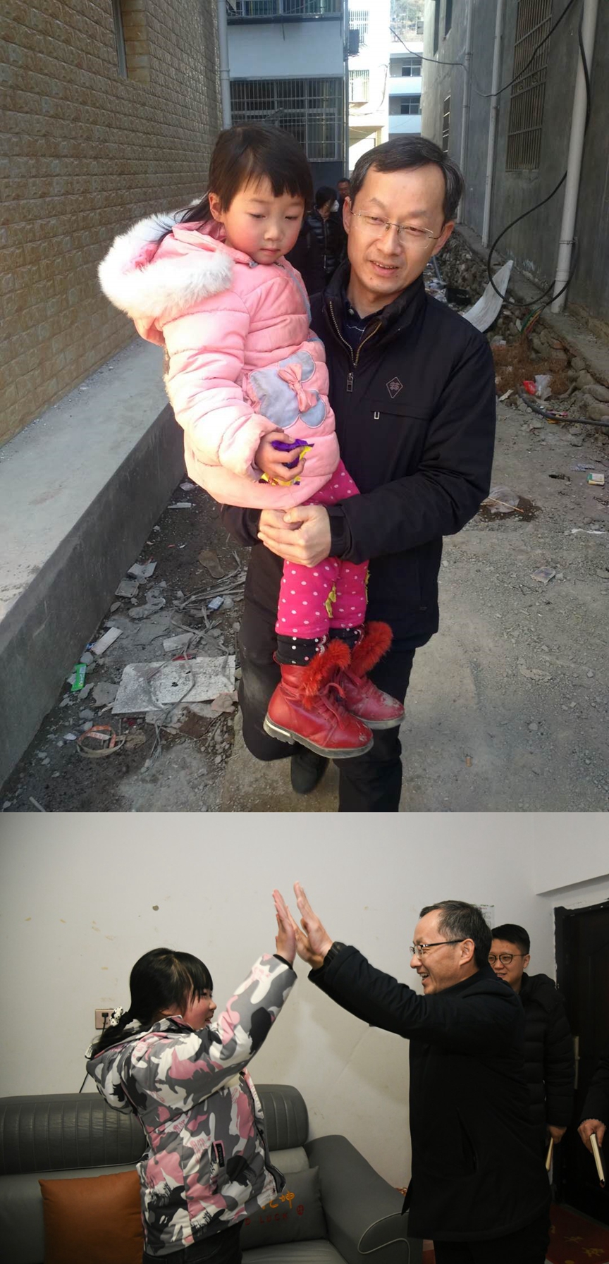 这是一张拼版照片。上图为:2018年1月,记者抱着4岁的杨梦琪到镇中心幼儿园(新华社记者 李华 摄);下图为:记者与杨梦琪击掌(新华社记者 张博文 摄)。