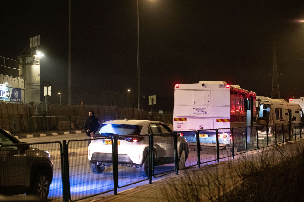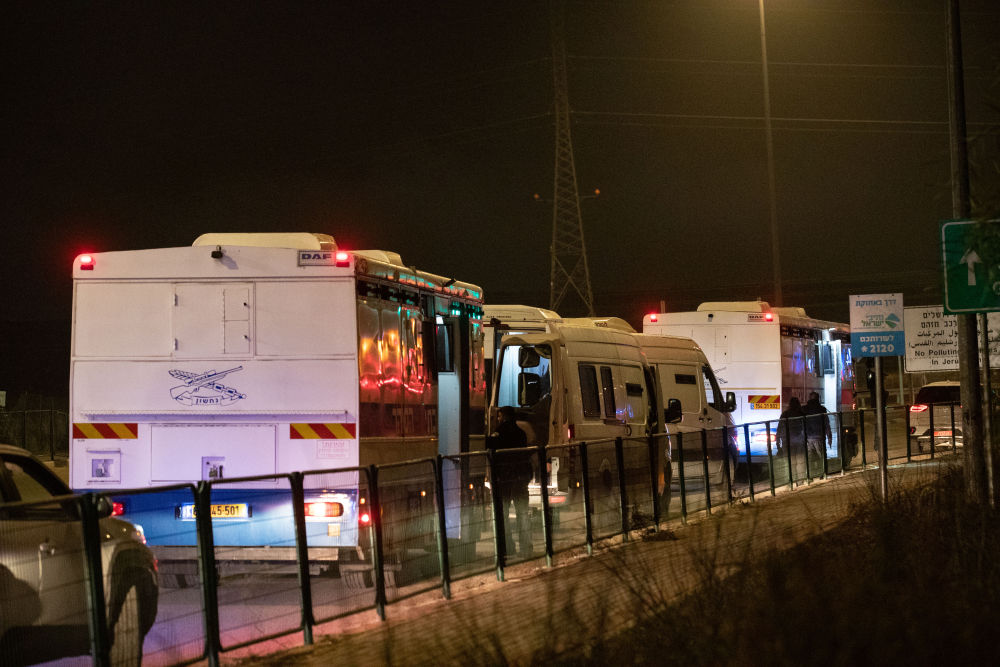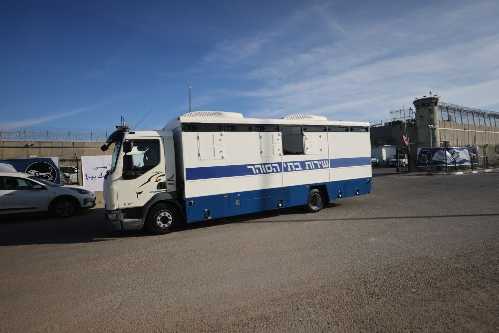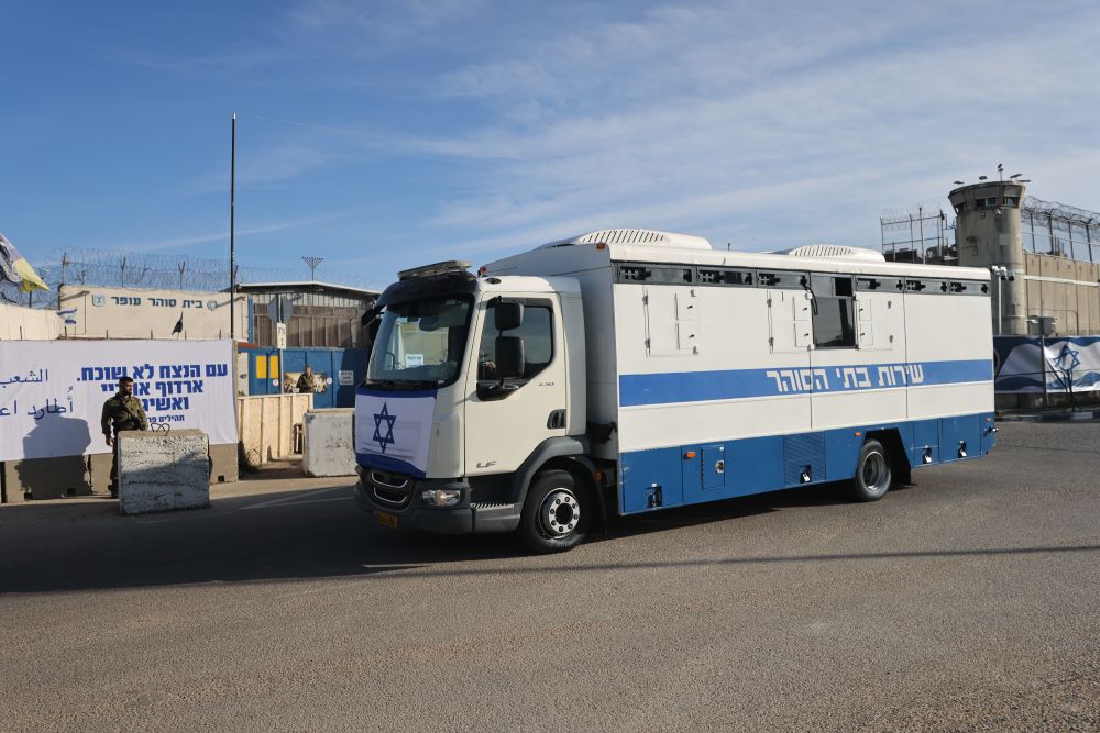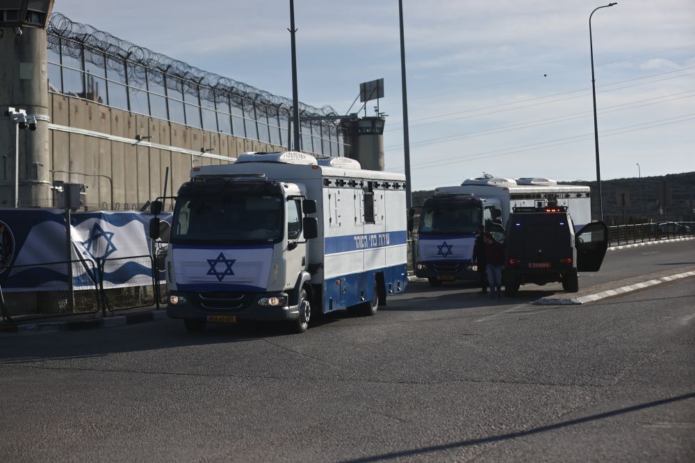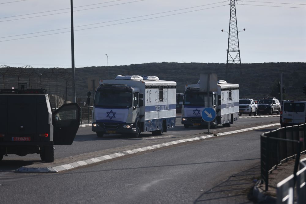 1月19日,在位于耶路撒冷附近的一处监狱外,用来转移巴勒斯坦被关押者的车辆停靠路边。新华社发(贾马尔·阿瓦德摄)