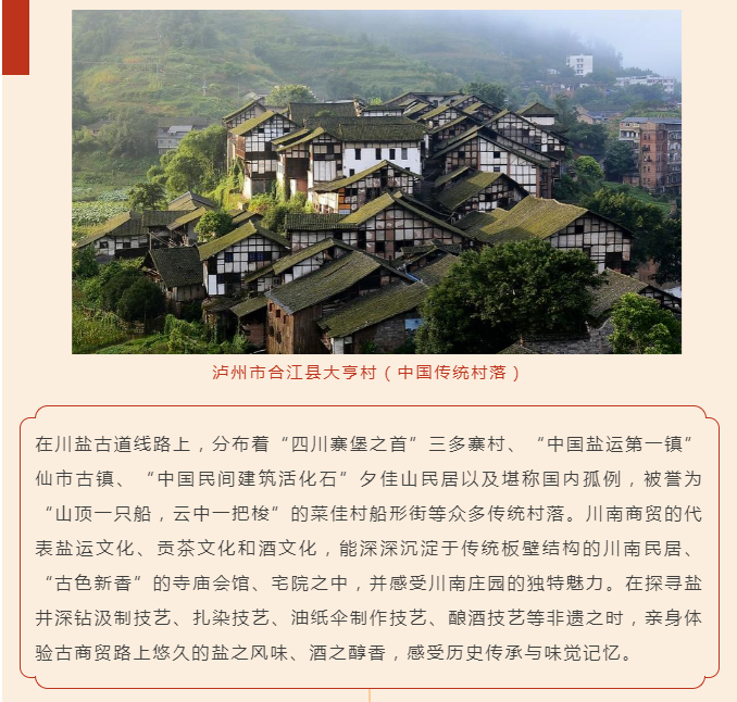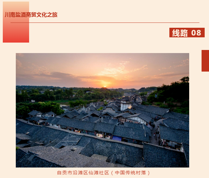 在川盐古道线路上,分布着“四川寨堡之首”三多寨村、“中国盐运第一镇”仙市古镇、“中国民间建筑活化石”夕佳山民居以及堪称国内孤例,被誉为“山顶一只船,云中一把梭”的菜佳村船形街等众多传统村落。川南商贸的代表盐运文化、贡茶文化和酒文化,能深深沉淀于传统板壁结构的川南民居、“古色新香”的寺庙会馆、宅院之中,并感受川南庄园的独特魅力。在探寻盐井深钻汲制技艺、扎染技艺、油纸伞制作技艺、酿酒技艺等非遗之时,亲身体验古商贸路上悠久的盐之风味、酒之醇香,感受历史传承与味觉记忆。