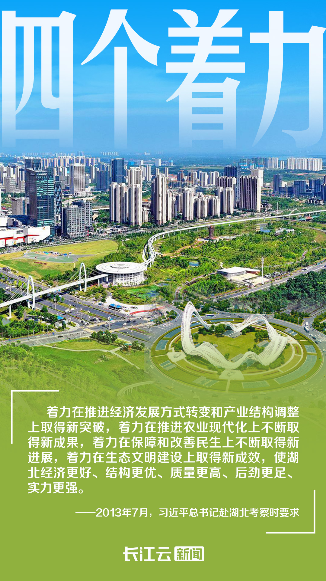 2013年7月,习近平总书记首次考察湖北时提出“四个着力”,要求“努力把湖北建设成为中部地区崛起重要战略支点”“争取在转变经济发展方式上走在全国前列”。