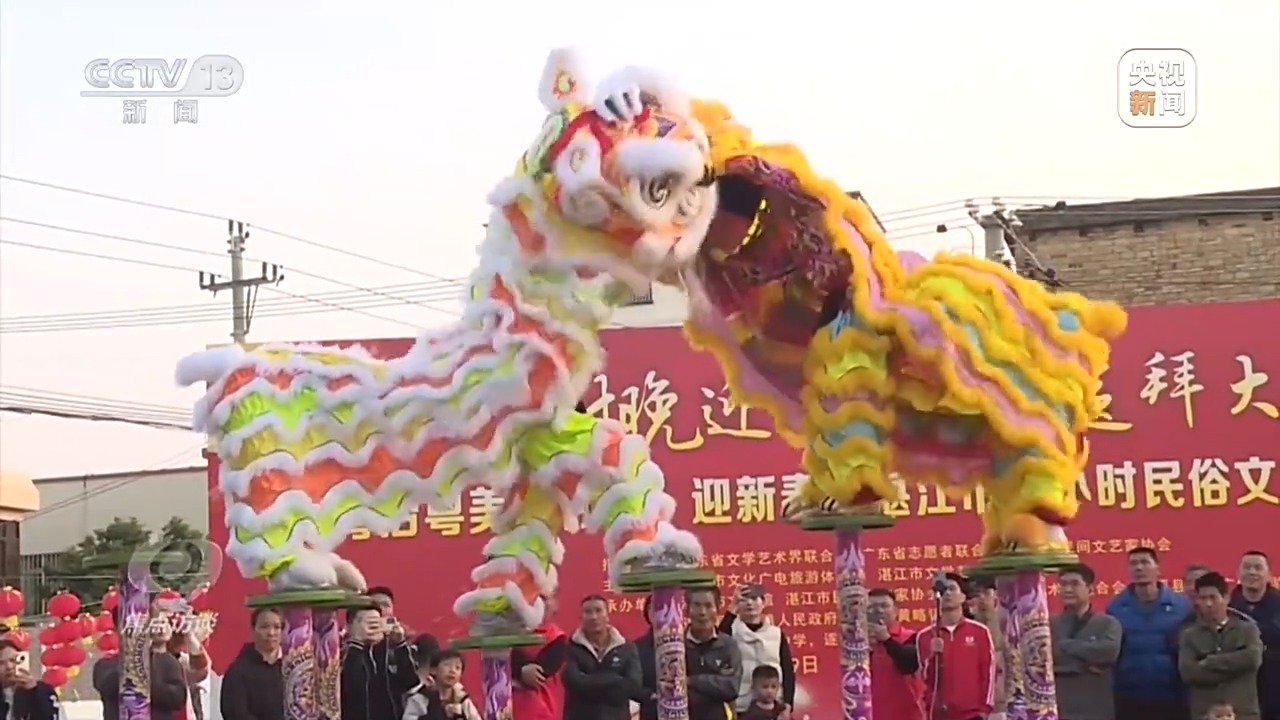 “醒狮醒国魂,击鼓振精神”。翻腾跳跃、威风凛凛,大年初一,遂溪龙湾龙狮团正在表演高桩醒狮。中国的舞狮文化分南狮、北狮两大门类,迄今已有1200多年历史。广东醒狮是中国狮舞中的南狮,2006年入选第一批国家级非物质文化遗产名录。舞狮表演是辞旧迎新、迎祥纳福的重要仪式,是最隆重的贺岁活动之一,威猛飒爽的醒狮表演不仅增添节日喜庆热闹氛围,更成为中华文化的精神符号,鼓励中华儿女不畏艰险、勇往直前。