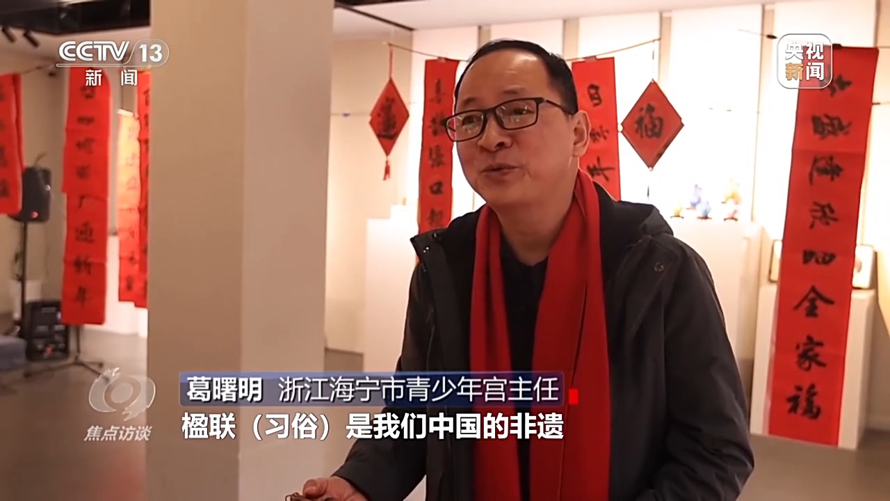 浙江海宁市青少年宫主任 葛曙明:一副小小的春联其实承载着很厚重的文化。楹联习俗是我们中国的非遗,书法也是在2009年列入了人类非物质文化遗产代表作名录。更重要的是今年我们的新春佳节,春节文化也列入了人类非物质文化遗产代表作名录,所以我觉得送春联是一件很有意义的事情。