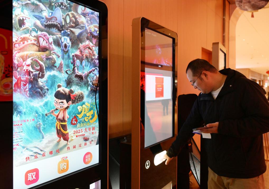 1月29日,一名观众在北京天天中影汇影院大堂的自助取票机上取电影票。新华社记者 李贺 摄