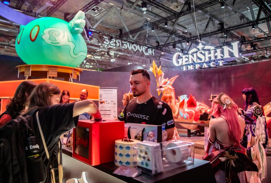 2024年8月22日,人们在德国2024年科隆国际游戏展米哈游《原神》展台参与互动活动。新华社记者 张帆 摄