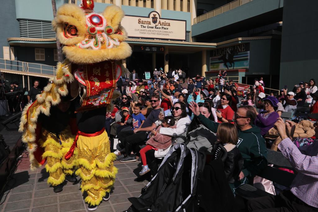 2月1日,演员在美国阿卡迪亚市举行的春节庆祝活动上表演舞狮。新华社发(邱晨摄)