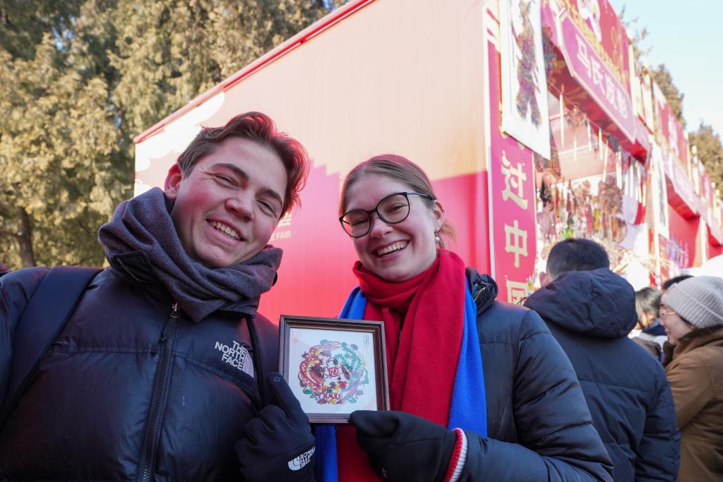 在北京地坛庙会上,来自瑞士的游客马克西姆(左一)和莉莎(左二)在展示购买的纪念品(1月29日摄)。新华社记者 鞠焕宗 摄