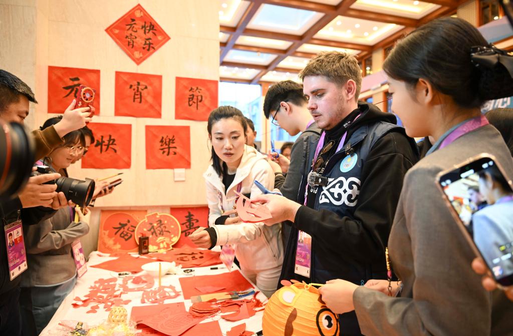 2月12日,一名哈萨克斯坦记者在活动现场体验剪纸。当日是农历正月十五元宵佳节。在第九届亚洲冬季运动会亚布力赛区山地媒体中心,工作人员举行舞龙舞狮表演、制作花灯、剪纸等互动活动,共度佳节。新华社记者 胡虎虎 摄