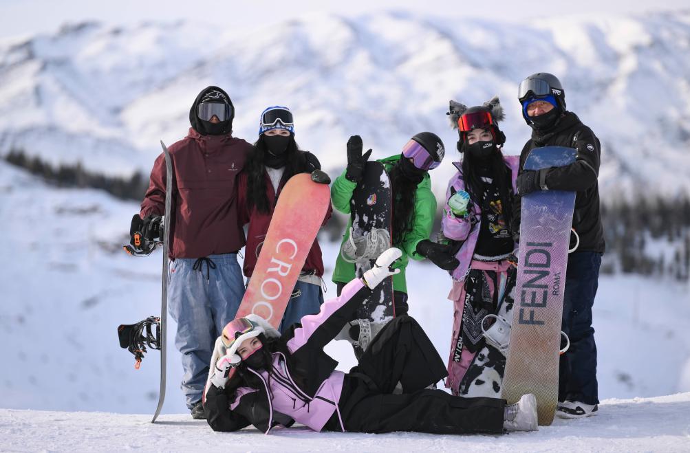 1月28日,来自浙江的“95后”姑娘张琦彬(前)与一起滑雪过年的同伴们在新疆阿勒泰将军山国际滑雪度假区合影。新华社记者 胡虎虎 摄