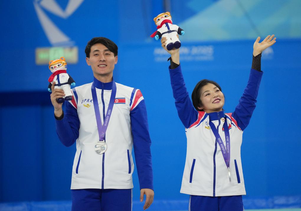 2月12日,朝鲜组合廉太钰(右)/韩锦澈在颁奖仪式上。新华社记者 颜麟蕴 摄