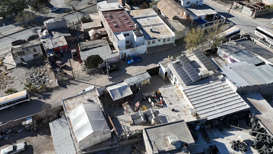 这是2025年2月2日在墨西哥奇瓦瓦州华雷斯城拍摄的一处移民收容所(无人机照片)。新华社记者李梦馨摄