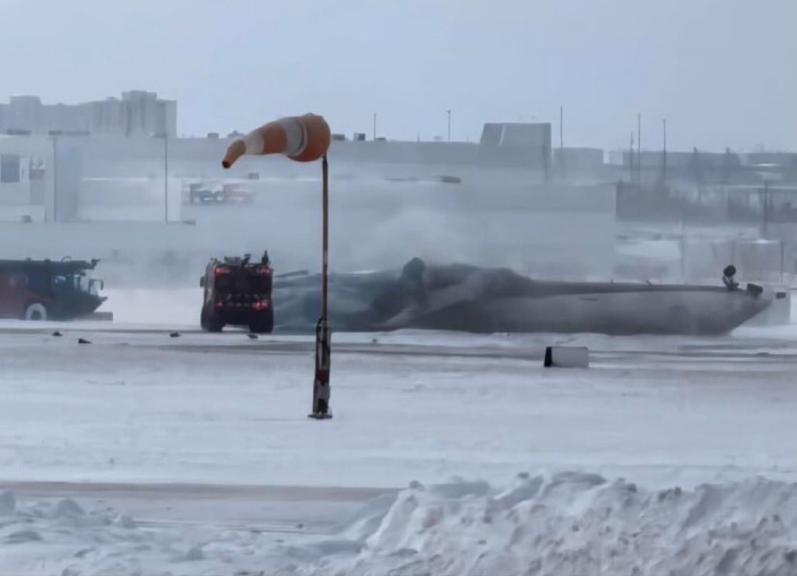 从现场视频来看,飞机机腹朝上,现场有浓烟冒起。事故原因初步认为是恶劣天气。预计事故调查将由加拿大运输安全委员会领导。