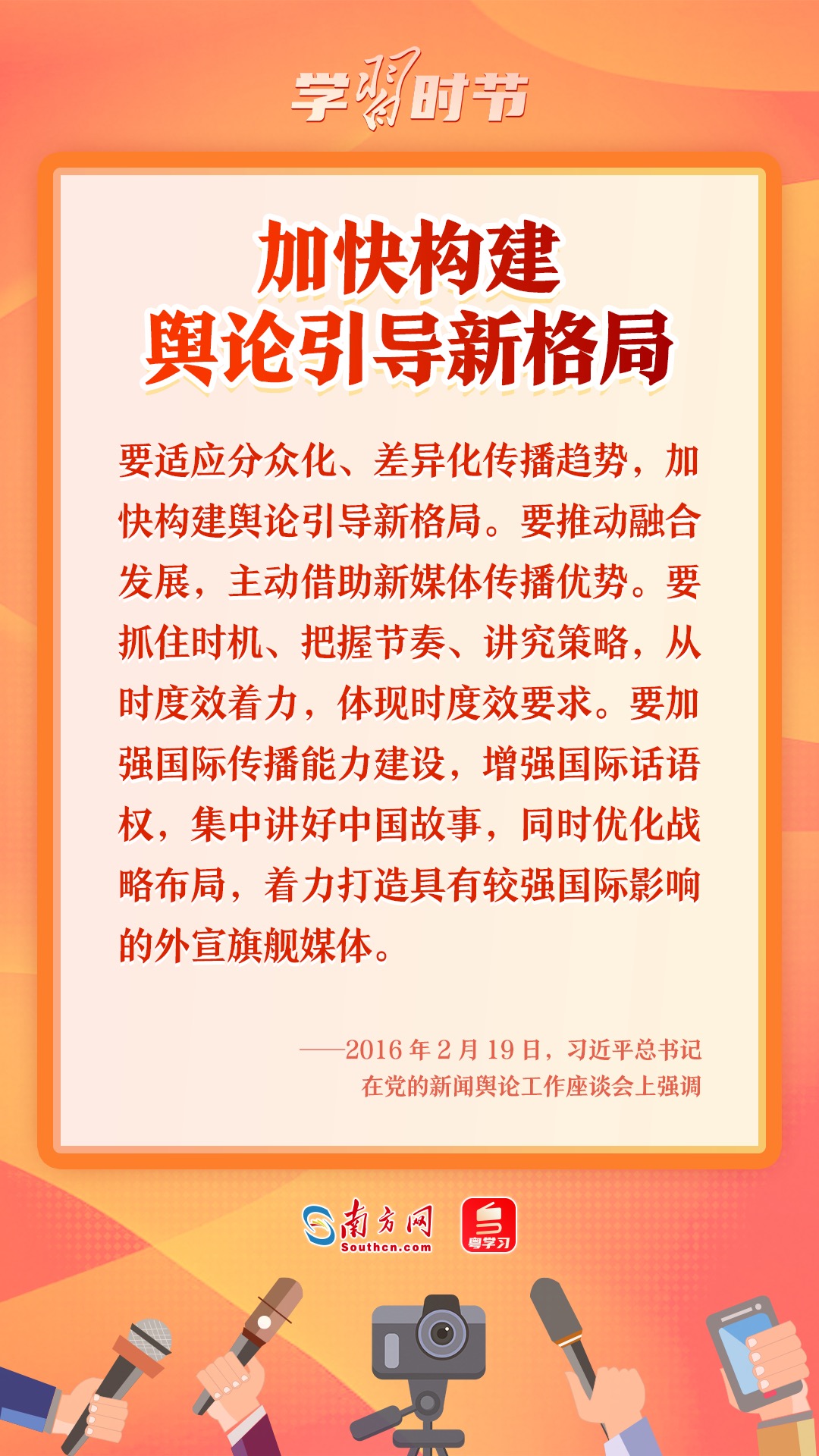 2016年2月19日,习近平总书记主持召开党的新闻舆论工作座谈会并发表重要讲话。他强调,“党的新闻舆论工作是党的一项重要工作,是治国理政、定国安邦的大事”。