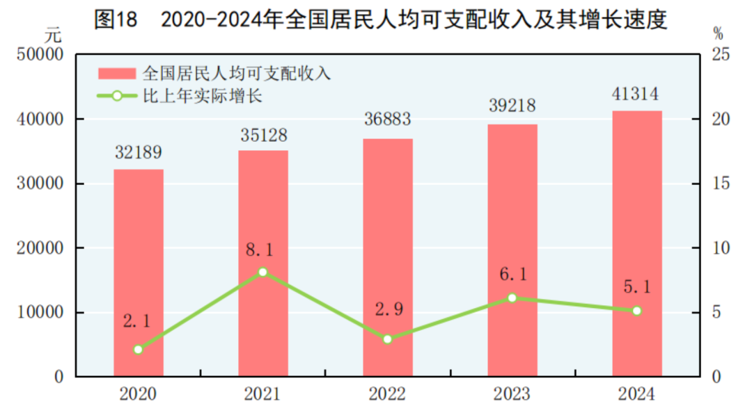 全年全国居民人均可支配收入41314元,比上年增长5.3%,扣除价格因素,实际增长5.1%。全国居民人均可支配收入中位数34707元,增长5.1%。