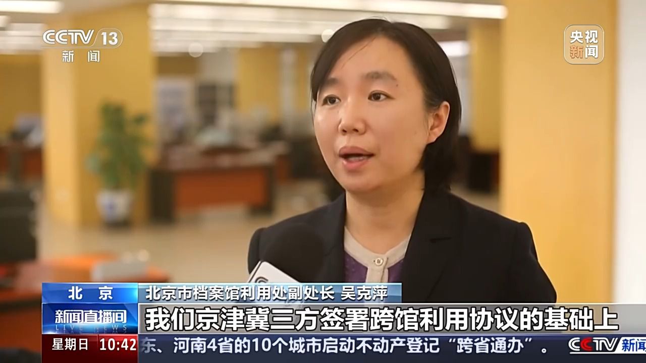北京市档案馆利用处副处长 吴克萍:我们京津冀三方签署跨馆利用协议的基础上,近些年我们还先后跟辽宁省档案馆、山西省档案馆,还有成都市、宁波市也分别签署了跨馆利用的协议,把异地出证的范围进一步扩大。