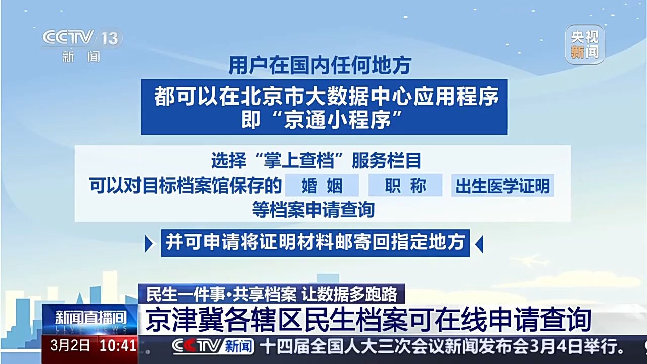 据介绍,根据居民所在区域,民生档案一般存放在市、区两级档案馆。目前,京津冀三地民生档案已经逐步打通各市、区两级档案馆之间的数据连接,方便市民使用。