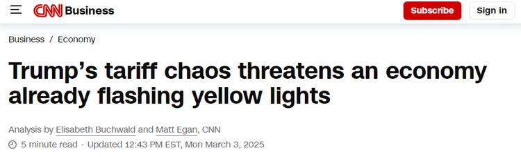 CNN的另一篇报道则通过直观数据展示特朗普关税政策对美国股市造成的冲击:自特朗普在白宫记者会上确认关税措施将生效后,道琼斯指数暴跌650点,在下午交易时段甚至一度暴跌近900点;标普500指数创下今年以来最大单日跌幅,下跌1.76%;纳斯达克综合指数下跌2.64%,自特朗普就职以来,纳斯达克指数已累计下跌约6.5%;华尔街“恐慌指数”VIX飙升至今年以来最高点。专家表示,由于关税政策造成的不确定性,美国总统大选后的“特朗普涨势”已被抹去,物价上涨的预期让投资者感到不安。