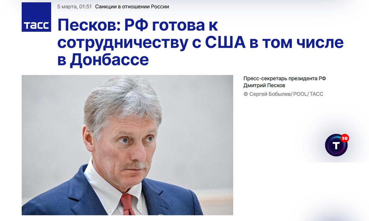 佩斯科夫:俄罗斯愿意与美国合作,包括在顿巴斯地区 图源:塔斯社报道截图