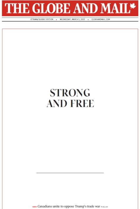 当地时间3月5日,加拿大报纸《环球邮报》在其纸质版首页“开天窗”,仅刊登了“强大和自由”几个词。图片来源:社交媒体平台截图