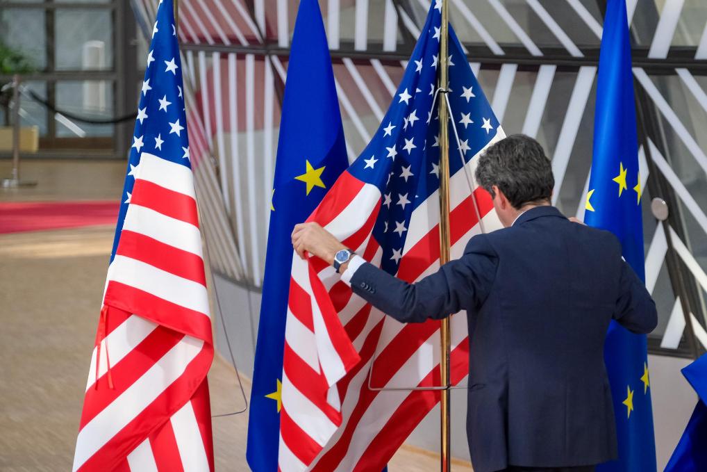 2022年3月24日,工作人员在比利时布鲁塞尔的欧盟总部整理美国国旗。新华社记者张铖摄