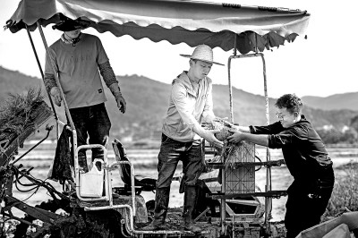 云南大学多年生稻科技小院的学生(右一)帮助当地农民一起插秧。新华社发