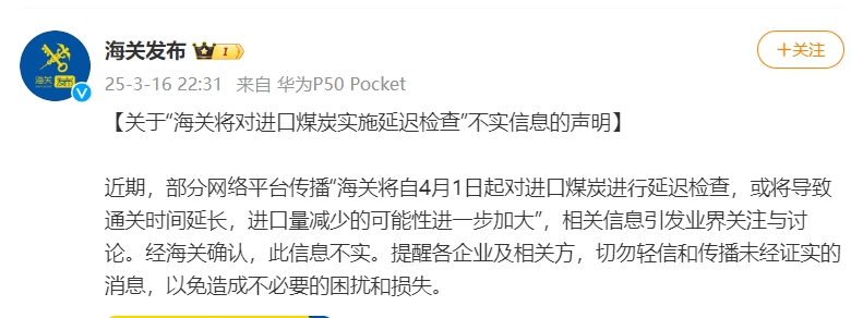 中新网3月17日电 据“海关发布”官方微博消息,近期,部分网络平台传播“海关将自4月1日起对进口煤炭进行延迟检查,或将导致通关时间延长,进口量减少的可能性进一步加大”,相关信息引发业界关注与讨论。经海关确认,此信息不实。提醒各企业及相关方,切勿轻信和传播未经证实的消息,以免造成不必要的困扰和损失。