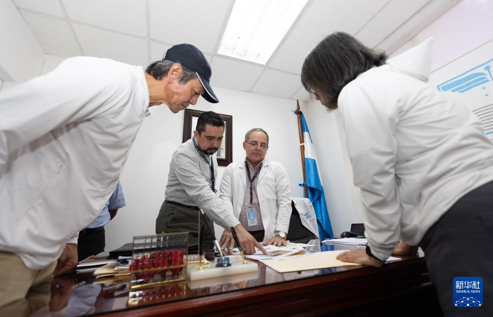 3月24日,在洪都拉斯首都特古西加尔巴的埃斯库埃拉医院,共享基金会团队与医院工作人员讨论净水设备安装方案。新华社记者 李梦馨 摄