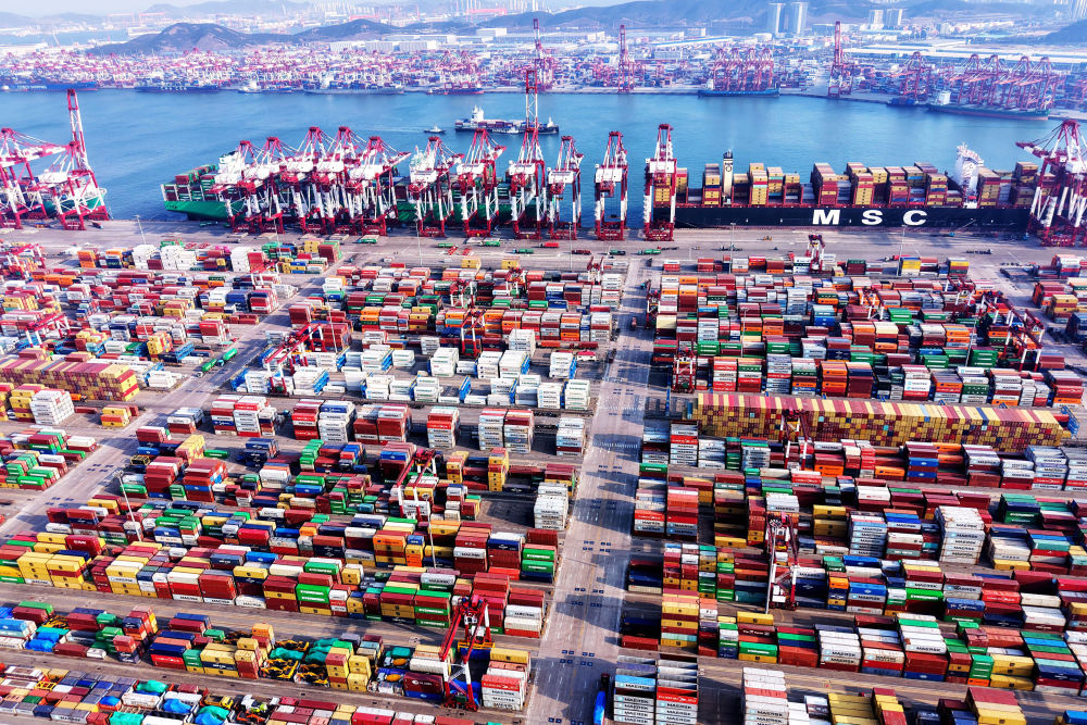 这是2月23日拍摄的山东港口青岛港外贸集装箱码头(无人机照片)。2025年以来,青岛港开通2条到东南亚、地中海方向的“一带一路”航线,合计新开4条国际集装箱航线,加快世界一流海洋港口建设。新华社发(俞方平 摄)