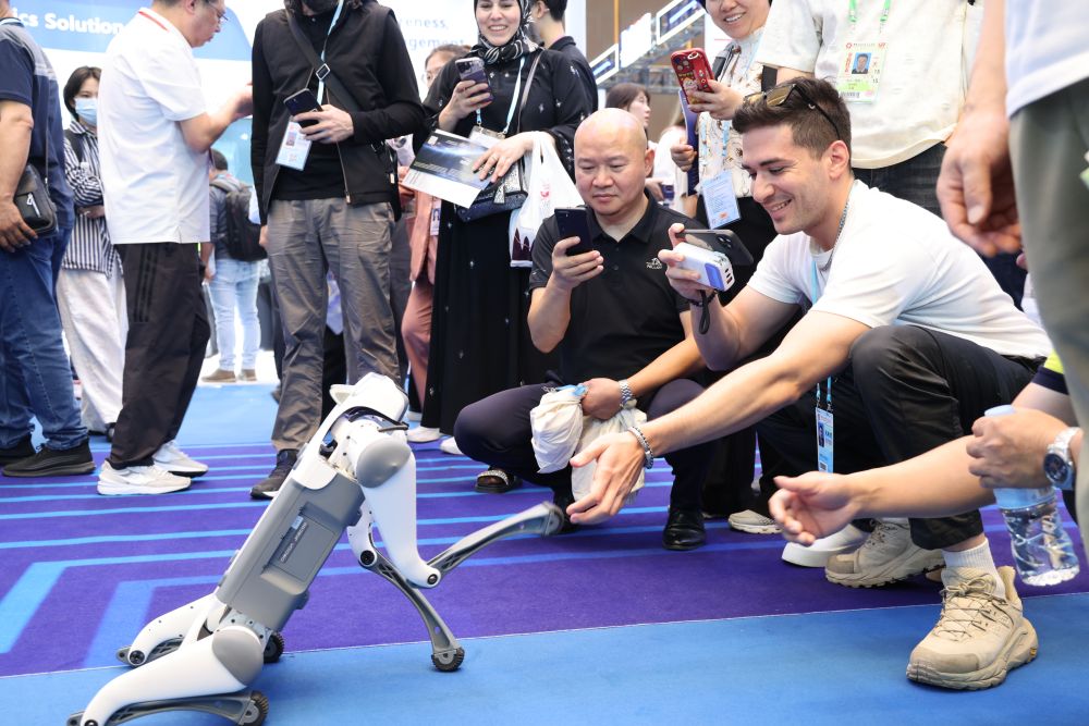 4月15日,在第137届广交会服务机器人专区,客商跟机器人互动。4月15日,有“中国第一展”之称的广交会迎来第137届。15日至19日举行的广交会第一期以“先进制造”为主题,首次增设服务机器人专区。第一期突出先进产业和科技支撑,参展企业达11304家,其中“新三样”、数字技术、智能制造相关题材参展企业约3700家。新华社记者 卢汉欣 摄
