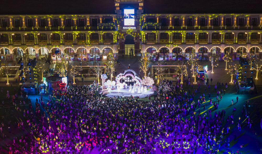 这是4月3日拍摄的第三届五大道海棠花节启幕现场(无人机照片)。明媚春日带动人们赏花踏青出游热情,“春日经济”热力十足。(新华社记者 赵子硕 摄)