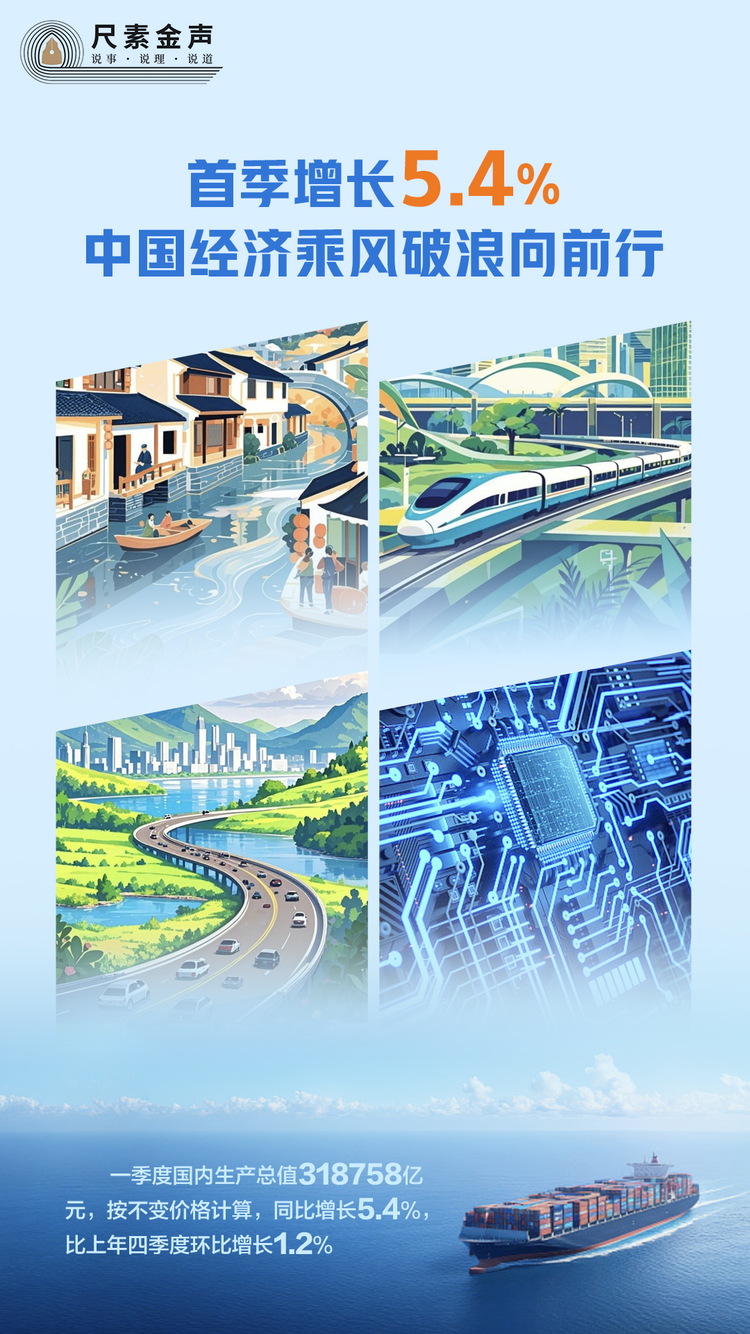 初步核算,一季度国内生产总值318758亿元,按不变价格计算,同比增长5.4%,比上年四季度环比增长1.2%。