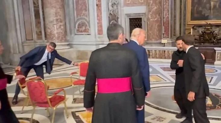 英媒报道也称,当时大厅里准备了三把椅子,当特朗普和泽连斯基坐下时,另一把椅子被匆匆移走,尚不清楚第三把椅子是给谁准备的,或为何无人就座,但最终在官员引导下,特朗普和泽连斯基进行了单独会谈。