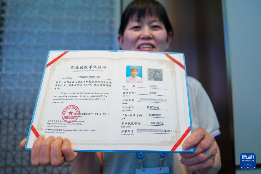 拿到首批证书的陆亚云今年51岁,来自江苏南通,近年来投身护理行业,为失能老人提供专业化的居家上门服务。“这张证书既是对我专业能力的认可,更增强了我对未来职业发展的信心。我将以这份新职业为起点,用专业和爱心服务更多的失能人员和家庭。”陆亚云说。