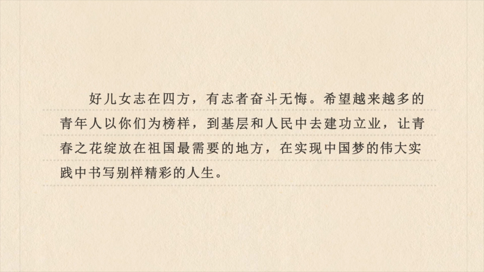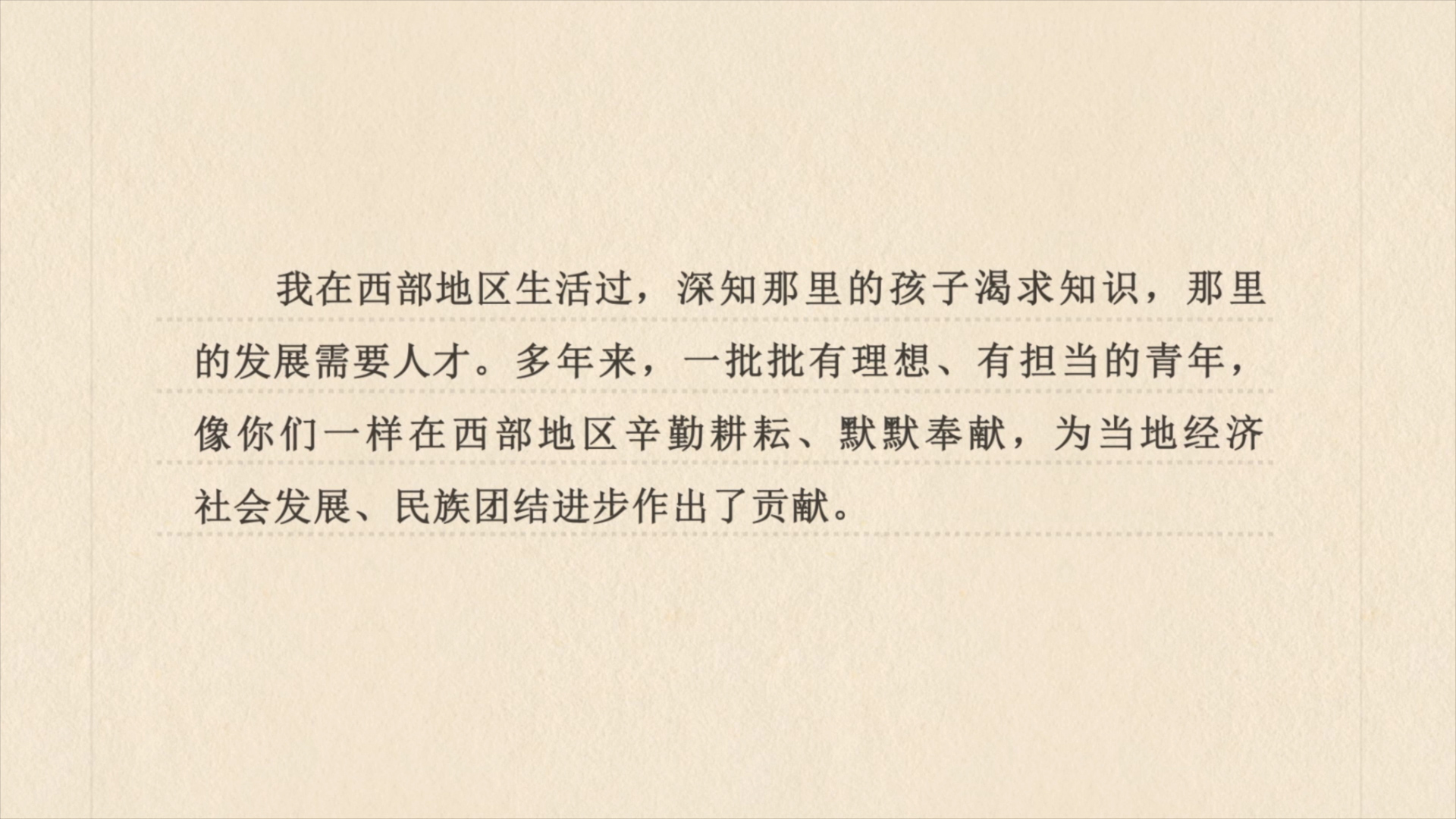 2000年 一群青年挤在绿皮火车上 用五天四夜穿越半个中国 他们攥着地图 向西,再向西! 最终停在塔克拉玛干沙漠东南边缘 一个在地图中几乎看不见的小黑点上—— 且末县 当年的且末县自然环境恶劣 这群刚毕业的学生来到以后 白天上课晚上备课到凌晨 教案上密密麻麻的笔记 见证了他们教育事业的初心 “既然需要我 那就一走就远一点儿 对得起国家的培养” 2003年 他们教出的第一届毕业生成绩 刷新了学校的中考记录 “摘掉‘老末’帽子,只用三年” 2014年 这群年轻人聚在一起 决定将这些年发生在且末的变化与故事 写成一封信 向习近平总书记寄出去 很快 总书记就给他们回了信 “我在西部地区生活过, 深知那里的孩子渴求知识, 那里的发展需要人才。 多年来,一批批有理想、有担当的青年, 像你们一样在西部地区 辛勤耕耘、默默奉献, 为当地经济社会发展、 民族团结进步作出了贡献。” 把青春压进粉笔 把理想刻进土地 从到了且末的那一天开始 他们便深深扎根在教育一线 如今 二十多年过去 这群年轻人 已经成了当地骨干教师或学科带头人 沙漠依旧苍茫 但有了书声琅琅为伴 便有了比胡杨更坚韧的生命 正如那封回信所言: “好儿女志在四方,有志者奋斗无悔。 希望越来越多的青年人以你们为榜样, 到基层和人民中去建功立业, 让青春之花绽放在祖国最需要的地方, 在实现中国梦的伟大实践中 书写别样精彩的人生。”