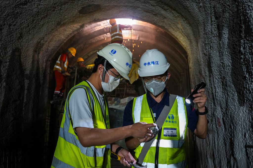 5月1日,在环北部湾广西水资源配置工程广西玉林市的一处建设工地,地质工程师通过岩石岩性判断掌子面的围岩类别。新华社记者 曹祎铭 摄