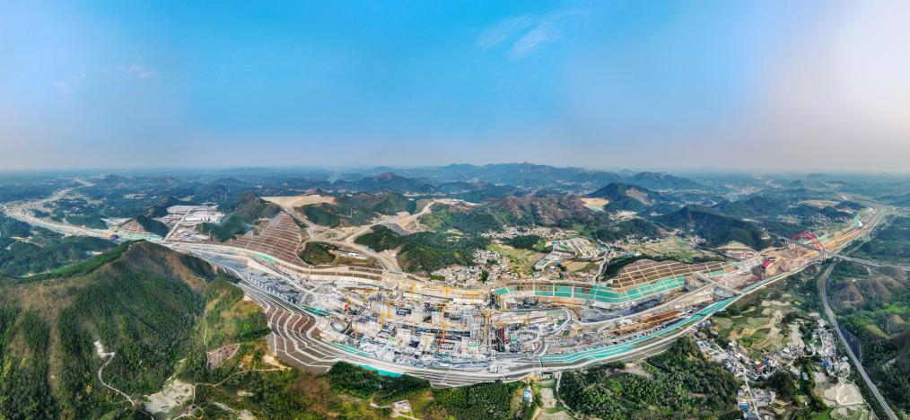 这是3月19日拍摄的广西平陆运河马道枢纽施工现场(无人机全景照片)。新华社记者 周华 摄