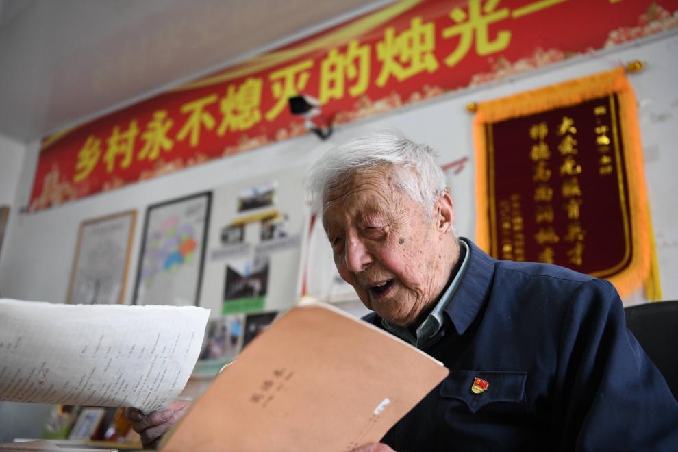 安徽马鞍山卜陈村的午后,阳光和煦。三尺旧讲台上,97岁的叶连平正在给学生们上课。