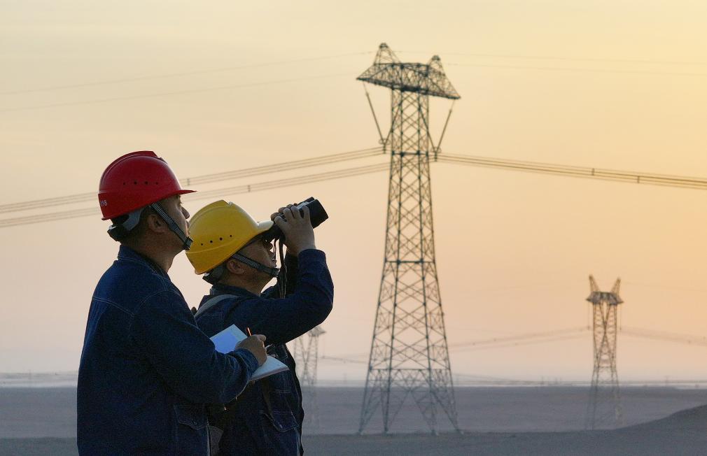 5月1日,在新疆哈密市雅满苏镇附近的±1100千伏昌吉-古泉特高压直流输电线路旁,新疆送变电公司员工对线路开展巡视(无人机照片)。新华社发(张利民 摄)