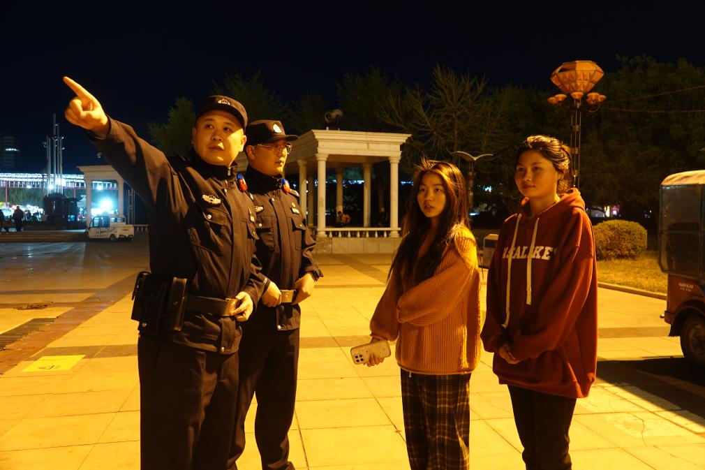 5月1日,在辽宁省锦州市经济技术开发区海风广场,锦州市公安局经济技术开发区(滨海新区)分局民警在夜间巡逻时回答外地游客咨询。新华社记者 邹多为 摄