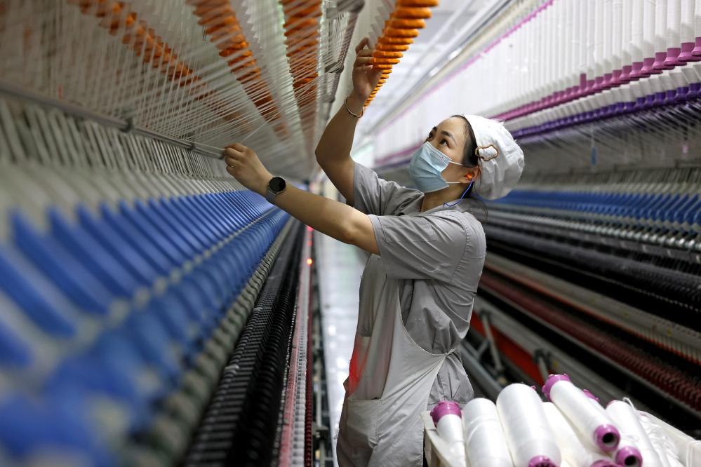 5月1日,山东枣庄经济开发区一家企业工人在加工纱线。新华社发(孙中喆摄)