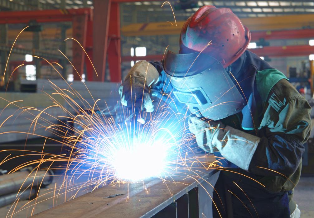 5月1日,工人在位于江苏省海安市南莫镇的一家公司生产车间内进行焊接作业。新华社发(周强摄)