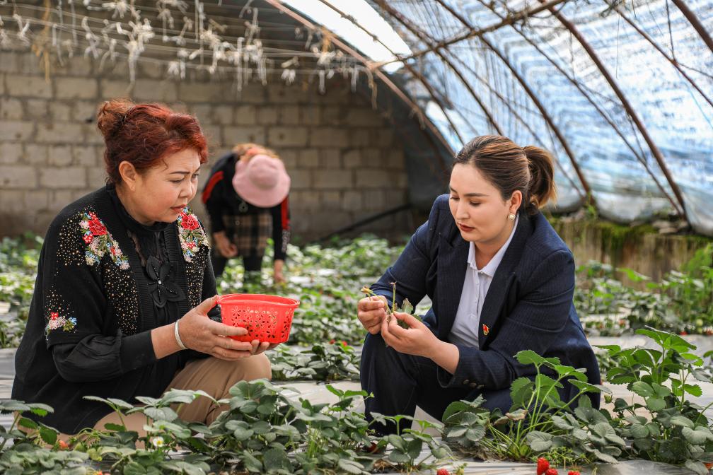 哈丽帕走访大棚种植户。新华社发(麦合木提·阿卜拉 摄)