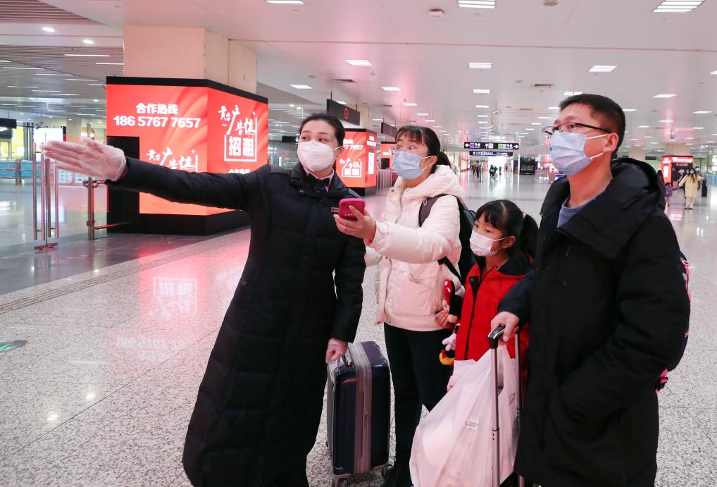 2023年1月21日,申通地铁集团运一公司员工高煜(左一)在地铁上海虹桥火车站站巡视时为旅客指路。新华社记者 方喆 摄