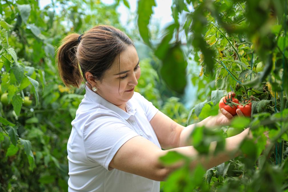 哈丽帕在大棚里帮助种植户采摘。新华社发(麦合木提·阿卜拉 摄)