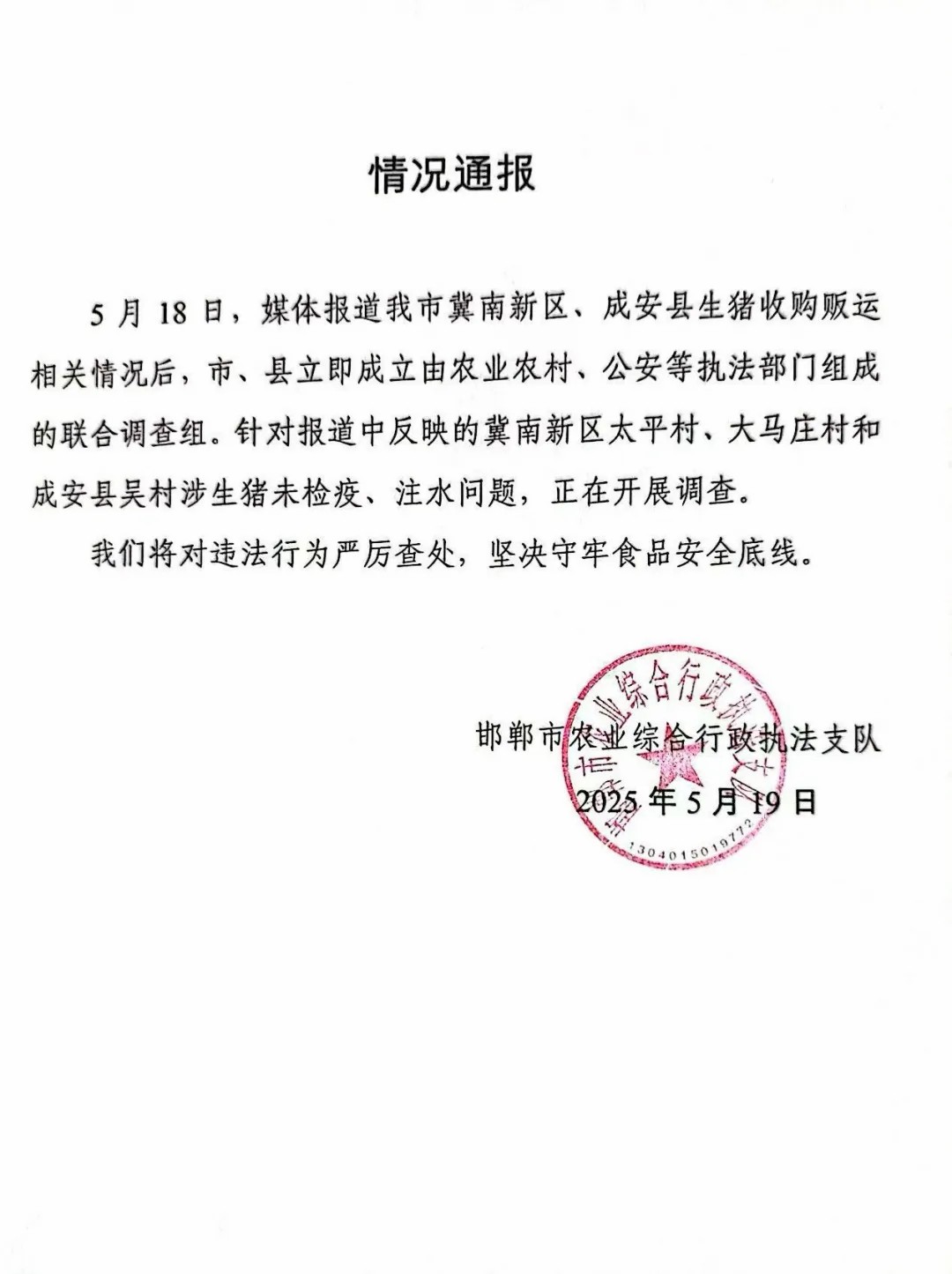 中国网5月19日讯 据“邯郸新三农”微信公众号消息,邯郸市农业综合行政执法支队19日发布情况通报称,5月18日,媒体报道河北邯郸市冀南新区、成安县生猪收购贩运相关情况后,邯郸市、成安县立即成立由农业农村、公安等执法部门组成的联合调查组。针对报道中反映的冀南新区太平村、大马庄村和成安县吴村涉生猪未检疫、注水问题,正在开展调查。