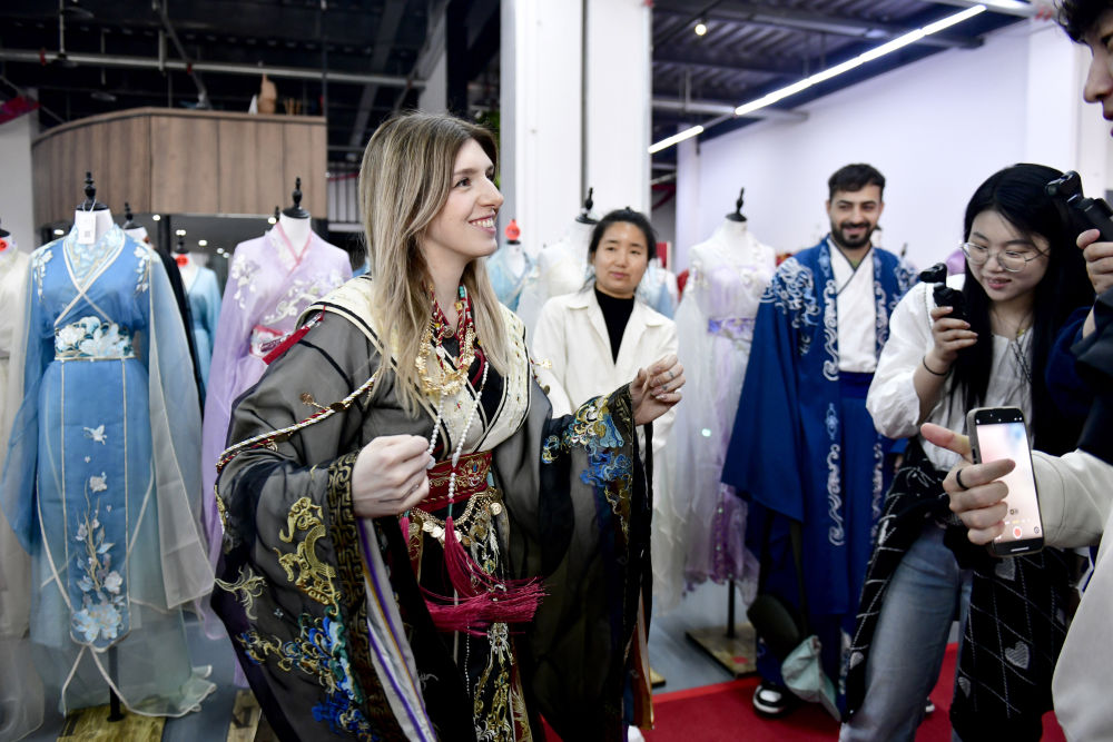 “太有创造力了!”腾龙图案的汉服令意大利博主卡米拉着迷,“我的社交平台粉丝也都非常喜欢。”第一次穿上汉服,埃及留学生阿卜杜勒·卡里姆兴奋地说:“汉服好美,穿上它好像回到古代中国,能感受到中国文化魅力。”