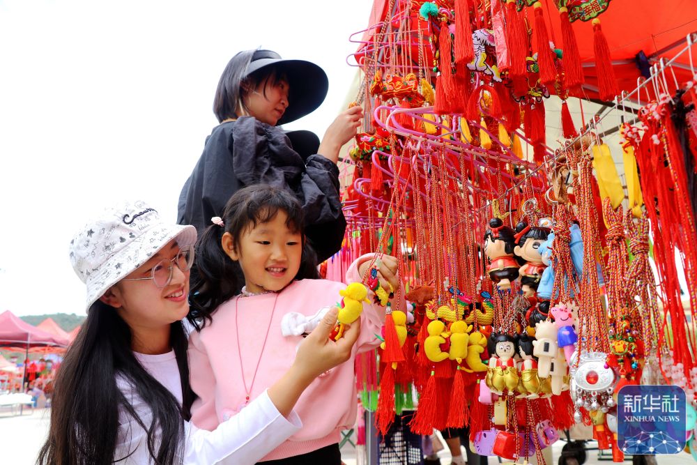 ↑ 5月24日,在甘肃省平凉市静宁县成纪文化城广场,人们在选购香荷包。新华社发(王毅摄)