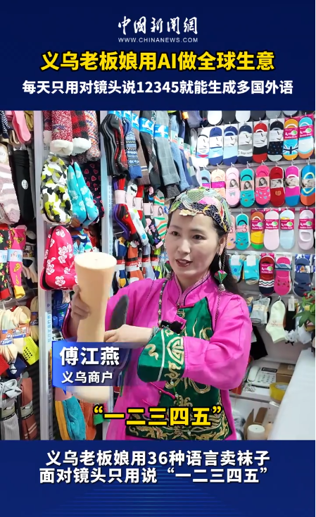 每天只需对镜头说“12345”,AI就能录下义乌老板娘傅江燕的形象,自动生成产品视频文案,并转化为36种语言精准触达全球客户。靠AI谈生意、接订单,义乌老板娘快人一步。(黄晓溪 实习生 项思妍)
