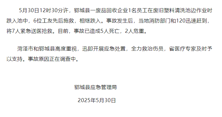 中国网5月30日讯 据山东省郓城县应急管理局消息,5月30日12时30分许,郓城县一废品回收企业1名员工在废旧塑料清洗池边作业时跌入池中,6位工友先后施救,相继跌入。事故发生后,当地消防部门和120迅速赶到,将7人紧急送医抢救。目前,事故已造成5人死亡,2人危重。