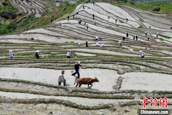 5月2日,广西桂林市龙胜各族自治县龙脊古壮寨举行一年一度“开耕节”,外国游客在体验农耕劳作。潘志祥 摄