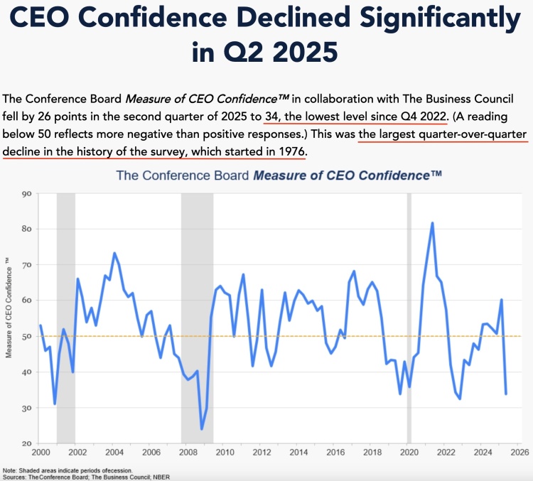 美国经济研究机构“世界大型企业联合会”日前发布的数据显示,美国第二季度首席执行官(CEO)信心指数从前一季度的60%跌至34%,为2022年第四季度以来的最低水平,也是该调查自1976年启动以来的最大环比降幅。